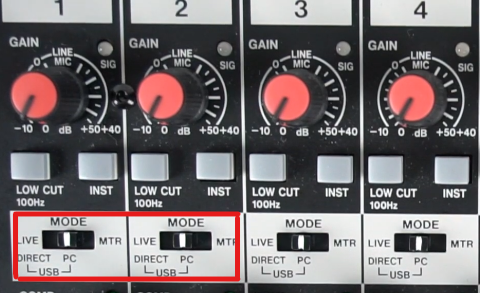 Schließen Sie Model 12 per USB an Ihren Computer an und installieren Sie die passenden Treiber. Stellen Sie den Schalter für den Input-Modus bei den Kanälen 1 und 2 auf die Mittelstellung (PC), diese beiden Kanäle dienen zur Wiedergabe des Masterkanals Ihrer DAW. Schließen Sie Kopfhörer oder Monitorboxen an den Ausgang des Model 12 an, um das Audiosignal zu hören.