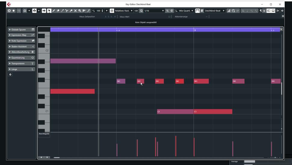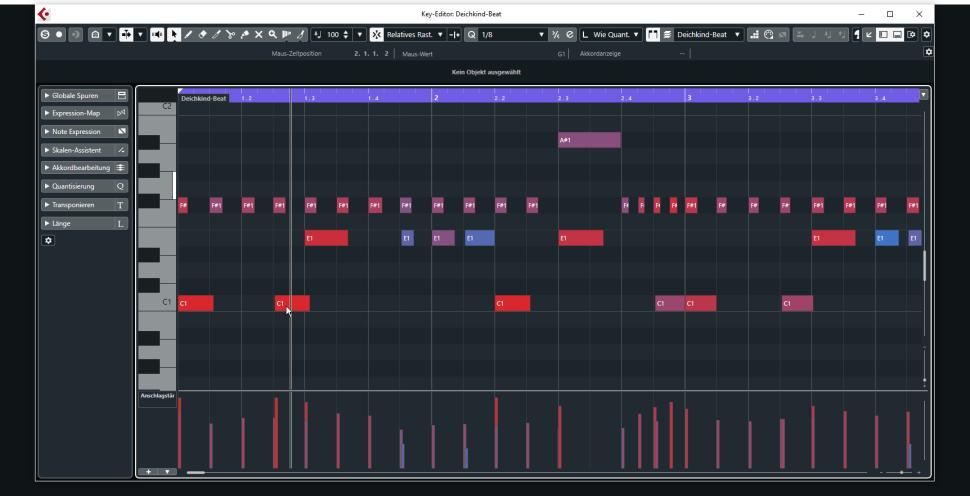„Dinge“ besitzt ein Tempo von 80 BPM, das Hi-Hat-Programming geht aber im doppelten Tempo leichter von der Hand. Für die Drums nutzen wir den Beatmaker Dope von UJAM (www.ujam.com) . Mit seinem kernigen LoFi-Klang eignet sich das Preset „Uptempo Banger v2“ bestens für unsere Zwecke. Die Grundlage des Beats ist ein zweitak- tiges Pattern, das immer wieder variiert wird.