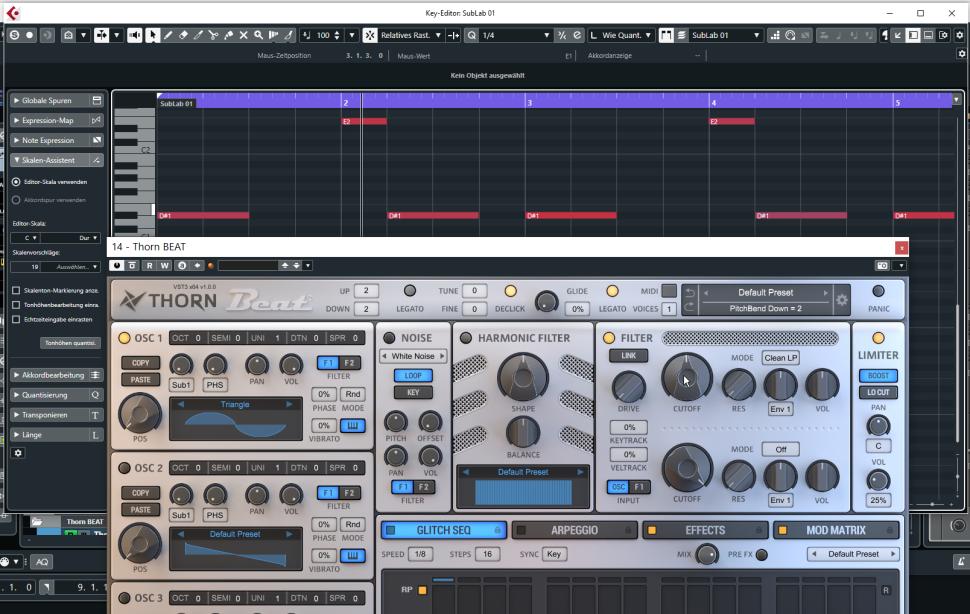 Für einen leichten Swing-Rhythmus erklin- gen die zweite und vierte dieser Noten ein bisschen verzögert. Den coolen Sub-Bass aus „Dinge“ programmieren wir mit Thorn BE aus dem Beat-Studio (Plug-in und Preset siehe Heft-Software) nach. Dieser spielt die darge- stellte Bassline. Durch einen tiefen Brass-Sound auf der Eins des viertaktigen Patterns klingt der Groove gleich richtig episch.