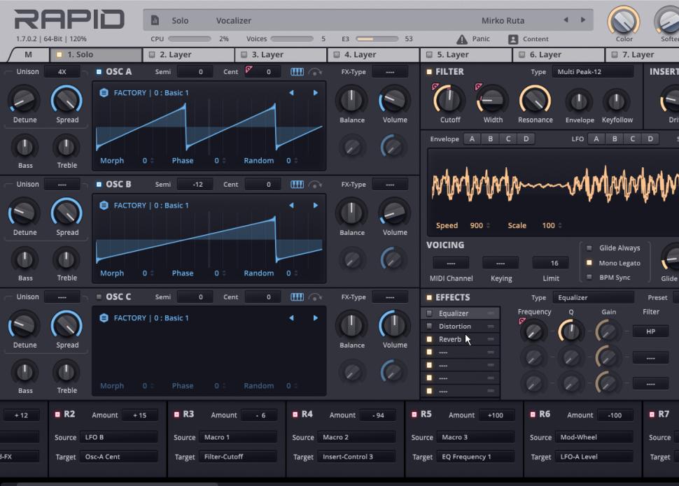 Das Preset „BR HipHop Brass Ensemble“ aus Vengeance Sound Avenger (www.vengeance-sound.com) mit einem langen Halleffekt eignet sich gut für diesen Zweck. Ein wichtiger Bestandteil des Grooves von „Dinge“ ist ohne Frage der prägnante Vocal-Lead-Sound. Der Synthesizer Parawave Rapid (www.parawave-audio.com) bringt mit dem Preset „Vocalizer“ aus der Kategorie „Leads Solo“ einen ähnlichen Klang mit.