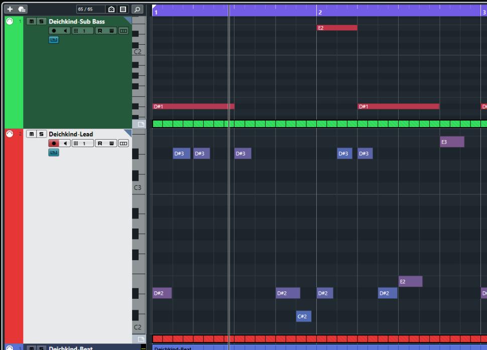 Die geschlossenen Hi-Hats spielen im ersten Takt und in der zweiten Hälfte des zweiten Takts ein durchgängiges Achtel-Pattern, wobei die Anschlagsstärke variiert. Auf eine leicht vorgezogene Open Hi-Hat auf der dritten Viertelzählzeit in Takt 2 folgen vier Sechzehn- telnoten mit ansteigender Anschlagsstärke, was dem Beat ein typisches Trap-Feeling verleiht.
