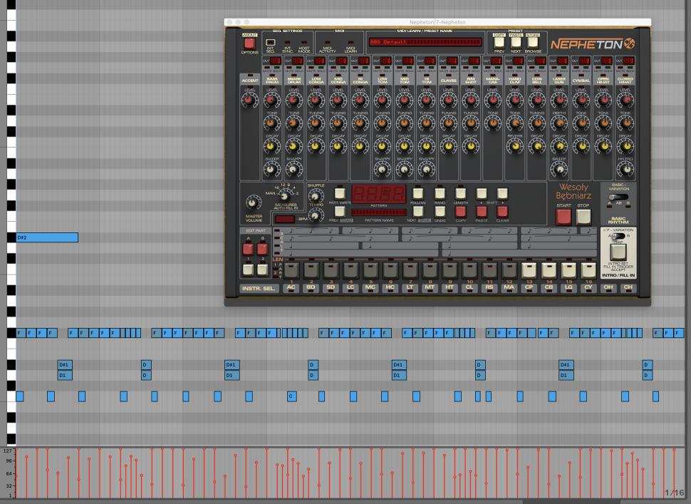 Als Beat-Grundlage verwenden wir den d16 Nepheton, jedoch können Sie ebenso gut ein anderes 808-Plug-in oder -Kit nutzen. Das zugehörige Pattern könnte typischer nicht sein: Bei 150 Bpm wechselt das Close-Hat zwischen 1/8- und 1/16-Mustern, Snare und Clap liegen auf jedem dritten Viertel pro Takt und auch die Kick spielt ein nur allzu bekanntes Pattern.