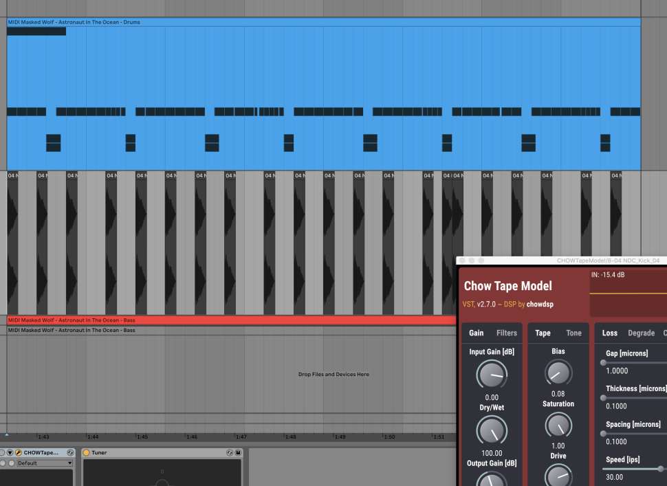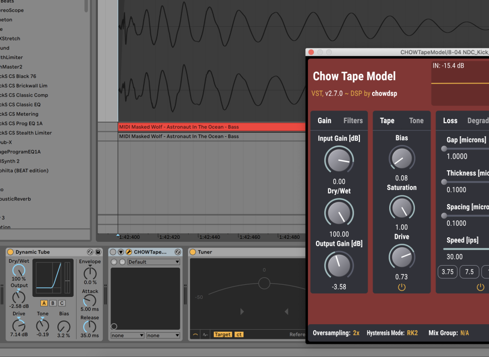 In diesem Falle verwenden wir Dynamic Tube von Ableton, alternative bietet sich die Freeware CHOWTape an. Dessen Drive drehen wir nur ein wenig auf, belassen Bias für weniger aggressiven Charakter bei nahezu null und nehmen per Tone etwas von den Höhen weg. Damit passt sich die Kick wesentlich besser in den Mix ein. Fehlt nur noch ein amtlicher Bass.