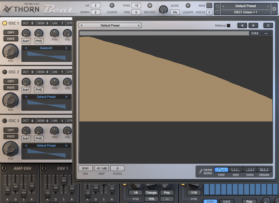 Denn einerseits ist die Verwendung einer kurzen Kick zusammen mit einem langen Bass üblich, um Melodien damit spielen zu können, andererseits lässt es mehr Freiheiten beim Sounddesign. Wir laden unseren Thorn BE mit einem Sägezahn für OSC 1. Per HARMONIC FILTER nehmen wir etwas von der Schärfe, indem wir ein fallendes Spektrum einzeichnen.