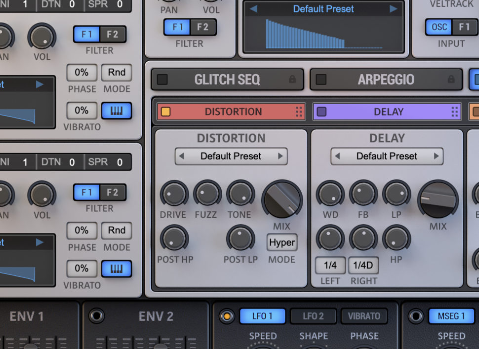 Per Lowpass-Filter mit CUTOFF auf 11 Uhr schneiden wir weitere Höhen weg. Damit sich Kick und Bass nicht überschneiden, stellen wir Attack auf 15%. Per Decay 35% und Sustain 0% sorgen wir für einen langsamen Ausklang. Bei Bedarf können Sie per DISTORTION Fülle hinzugeben: DRIVE und FUZZ auf 10 Uhr, POST LP auf 12 Uhr sowie TONE und MIX auf 100%.