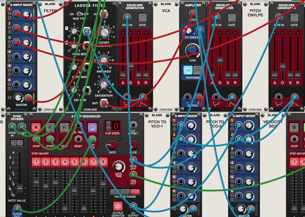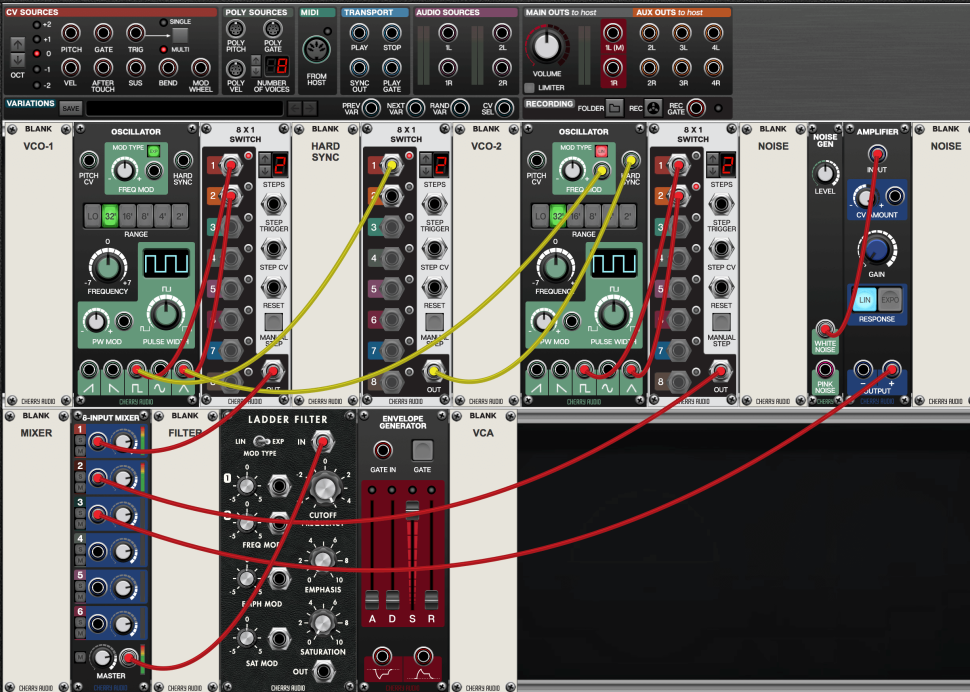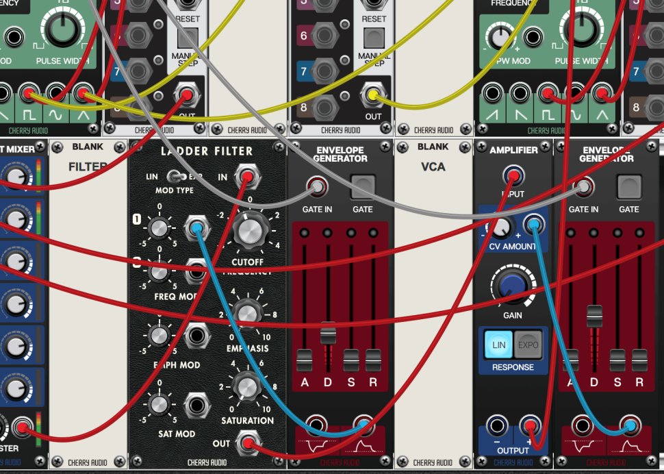 Für die Klangerzeugung fehlen nur noch Hüllkurven für Filter und Lautstärke, sowie ein Amp. Diese drei fügen wir hinzu, ebenso ein Blank-Panel für den VCA. Der Filter-Ausgang landet im AMPLIFIER, während die jeweils positiven Hüllkurven-Outs die in die CV-Eingänge von Filter und Amp geroutet werden. Der Amp Output führt zum MAIN OUT von Voltage-Modular.
