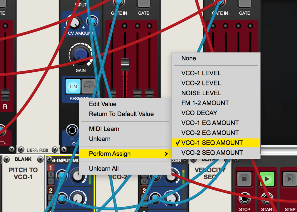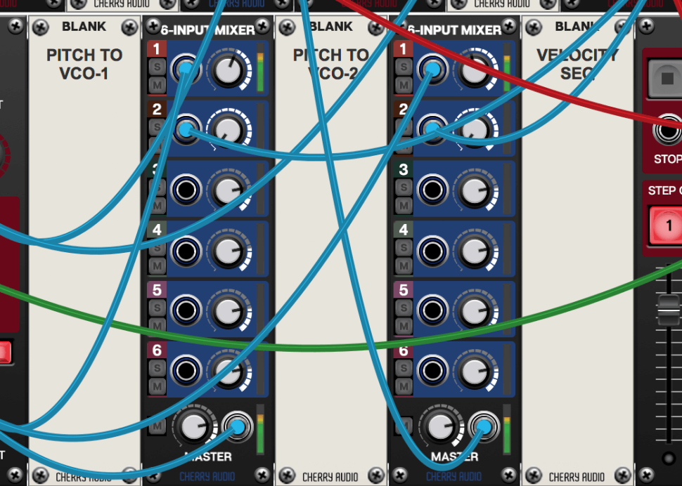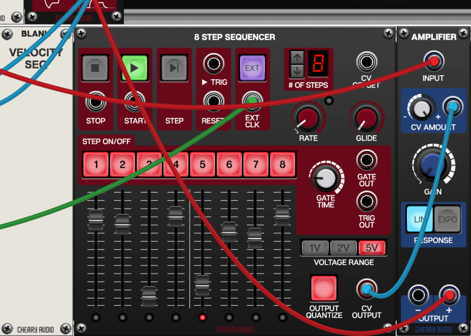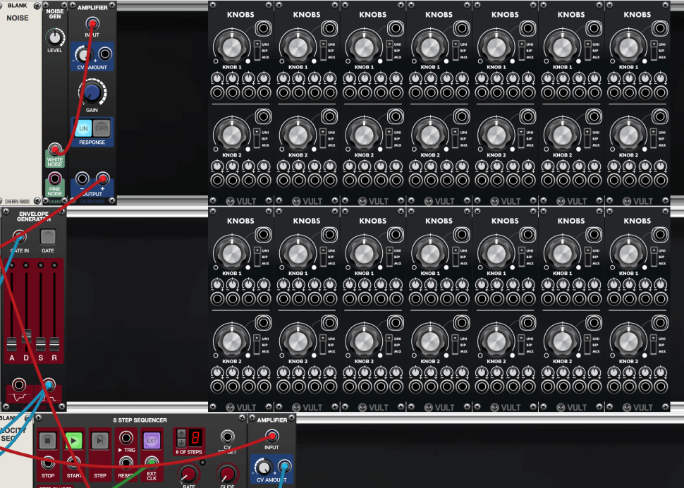 Führen Sie dessen positiven CV Out jeweils zum zweiten Eingang der beiden neuen Mixer. Somit lassen sich die Intensitäten von Sequenzer und Pitch-Hüllkurve pro Oszillator individuell regeln. Fehlt nur noch der Velocity-Sequenzer: Neben diesen laden wir einen weiteren Amp, verbinden CV OUTPUT mit dem Mod-Eingang des Amps und drehen CV AMOUNT voll auf.