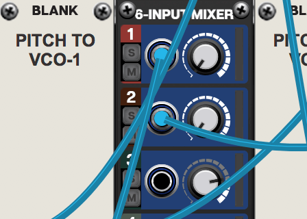 Damit die Sequenzer etwas bewirken, müssen wir sie mit Parametern verbinden. Der Pitch Sequenzer wirkt im DFAM mit individueller Intensität auf die Oszillatoren, weswegen wir zwei 6-INPUT-MIXER laden und in beide den CV Output des Sequenzers routen. Außerdem bauen wir noch einen weiteren ENVELOPE-GENERATOR ein, der ebenfalls die Tonhöhe moduliert.