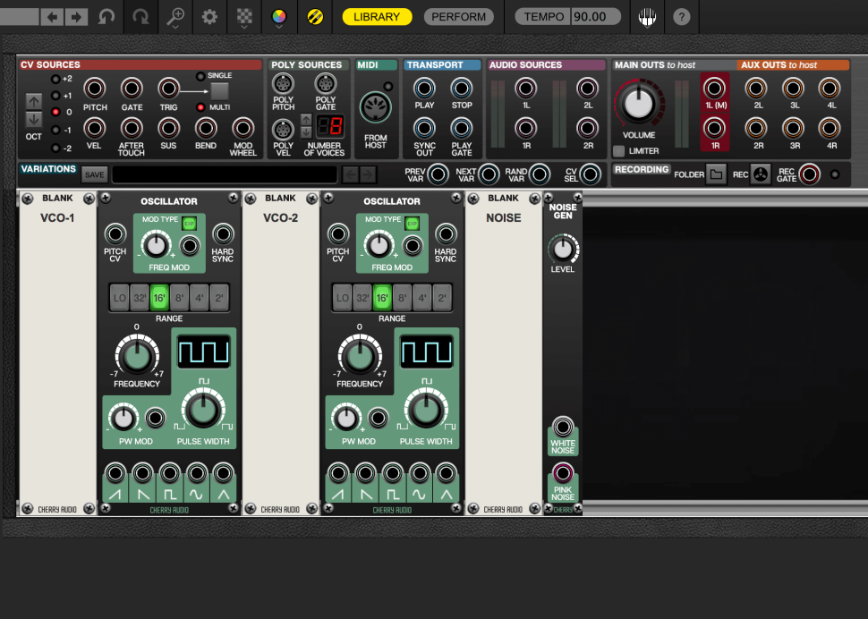 Das lässt sich doch auch am Rechner nachbauen, oder? Klaro! Wir verwenden dafür unseren Voltage Modular von Cherry Audio (siehe Heft-Software) und laden zu Beginn zweimal das Oscillator-Modul, sowie den Noise-Generator. Zwecks besserer Übersicht mit späterer Verkabelung fügen wir auch gleich mehrere Blank-Panels hinzu, die wir passend beschriften.