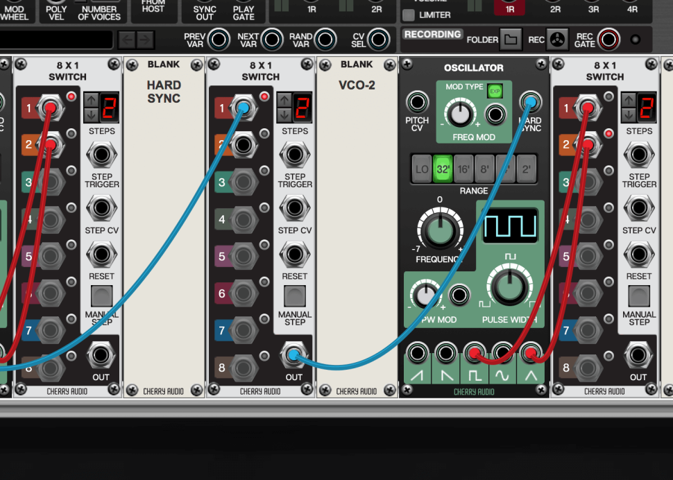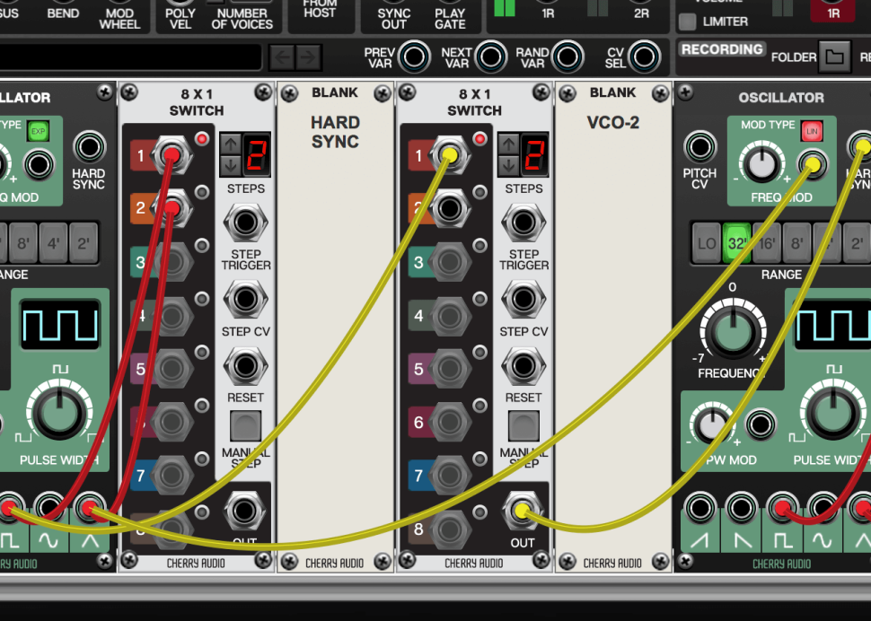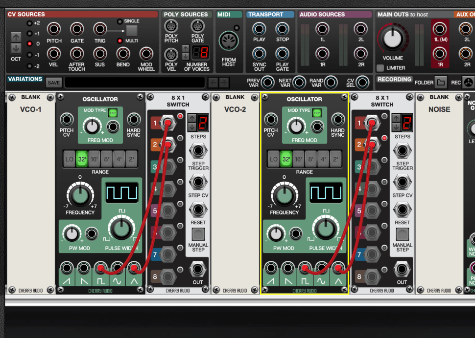 Um das Synchronisieren der Oszillatoren zu ermöglichen, laden wir einen weiteren Switch mitsamt Blank-Panel. Auch hier reduzieren wir die STEPS auf 2, verbinden aber nur den ersten Eingang mit dem Square-Out des VCO-1. Achten Sie darauf, das Kabel ausgehend vom Switch-Eingang zum Square-Out zu ziehen, ansonsten ziehen Sie das bestehende Kabel heraus.