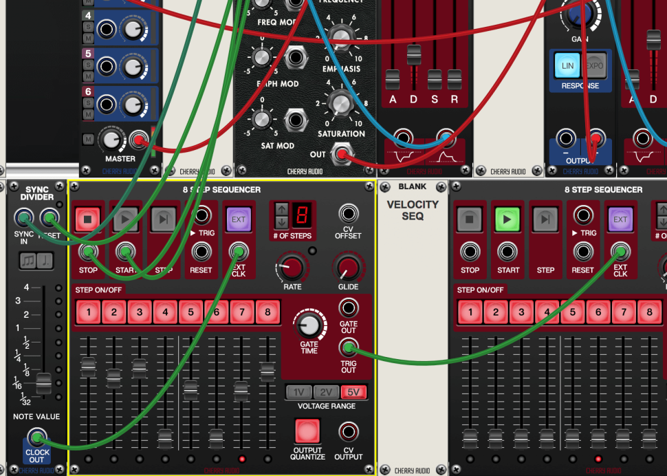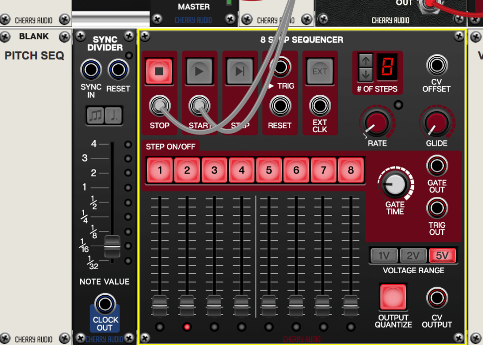 Kommen wir zum Herzen des DFAM: Den Sequenzern. Das 8-STEP-SEQUENCER-Modul kommt hier gerade recht. Laden Sie es zweimal mitsamt Blank-Panels, die wir „Pitch Seq“ und „Velocity Seq“ nennen. Wenn Sie das Programm als Plug-in nutzen, verbinden Sie PLAY und STOP bei TRANSPORT oben mit PLAY und STOP des ersten Sequenzers. Laden Sie ein SYNC-DIVIDER-Modul.