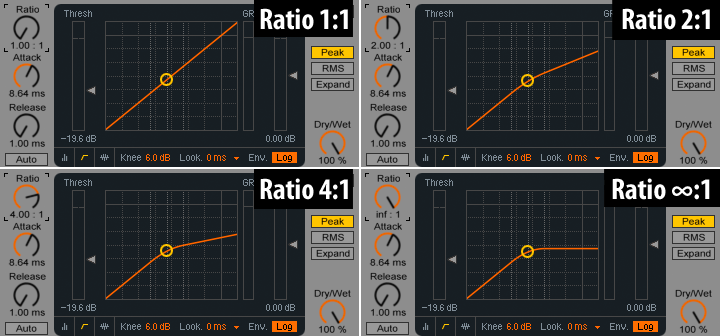 Kompression macht ein Signal prinzipiell erst einmal leiser, Peaks werden heruntergedrückt. Dadurch entsteht mehr Headroom und der Gesamtmix kann lauter gemacht werden, ohne zu übersteuern. Threshold bestimmt, ab welcher Lautstärke der Kompressor greift. Die Werte liegen immer im Minusbereich, 0 dB ist die maximale Lautstärke. Die Kompression greift also um so früher, je niedriger Threshold ausfällt. Ratio legt fest, um welchen Faktor die Lautstärke reduziert wird. Stellen Sie sich eine Blechdose mit geöffnetem Deckel vor, aus der Musik kommt. Je höher der Ratio-Wert, desto mehr schließt sich der Deckel. In vielen Plug-ins wird Ratio als Diagramm angezeigt, das ähnlich „den Deckel zumacht“. Brickwall Limiter arbeiten mit unendlich hoher Ratio, denn die Lautstärke, die höher als der Threshold liegt, wird nicht gedrückt, sondern schlichtweg abgeschnitten.