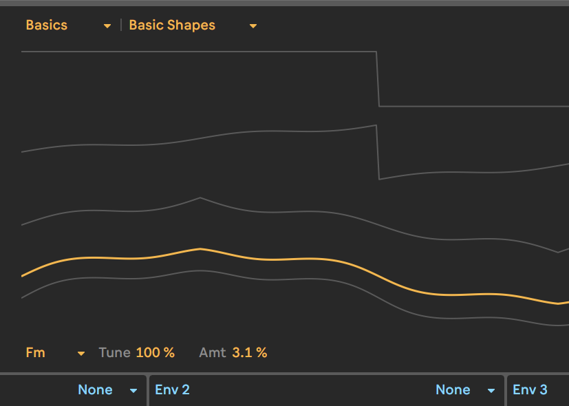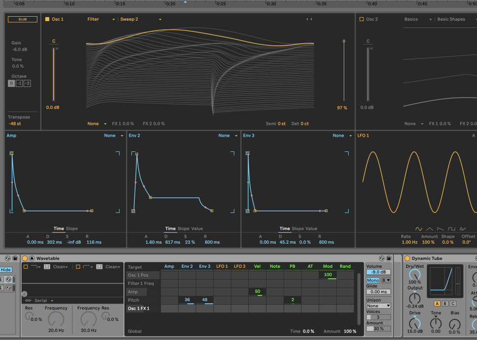 Klicken Sie den Wavetable an und erzeugen per STRG+G oder CMD+G ein Instrument Rack und laden einen zweiten Wavetable für den Bass-Part. Hier verwenden wir die Sinus-Wellenform, aktivieren jedoch den Fm-Effekt mit Tune 100% und Amt 3.1%, wodurch der Sound reichhaltiger wird. Auch aktivieren wir ein 24 dB-Tiefpassfilter und stellen Cutoff auf 9 Uhr.