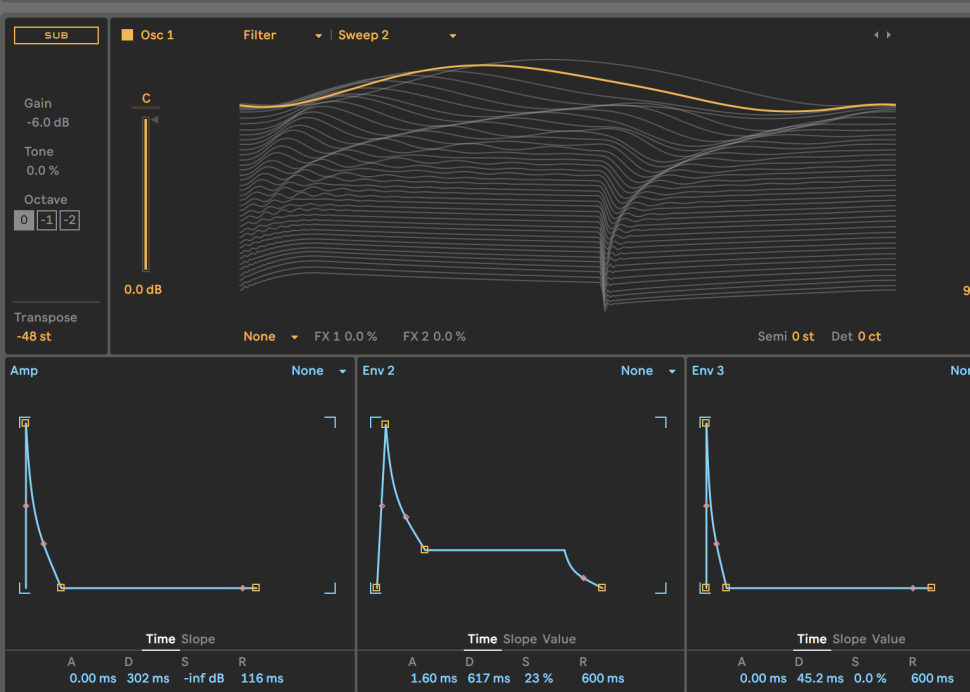 Transponieren Sie den Synth gleich um -48 Halbtöne nach unten und fahren Sustain beim Amp Envelope auf null, Decay auf rund 300 ms. Als Grundlage für den Sound verwenden wir die Wellenform Sweep 2 aus der Filter-Kategorie, alternativ tut es die Triangle der Basic Shapes. Das Knacken ist ist schnell erzeugt: Verbinden Sie Env 2 und Env 3 mit Pitch.