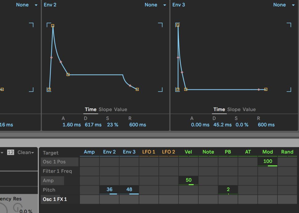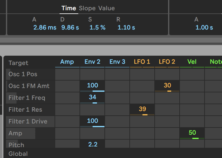 Per Modmatrix gestalten wir den Sound: Env 2 moduliert mit seinem langsamen Decay von 9 s den Osc 1 FM Amt zu 100%, die Filter Freq 1 zu 34%, Filter 1 Drive zu 100% und Pitch zu 2.2%. Die beiden LFOs wiederum modulieren Filter 1 Res zu 39% und Osc 1 FM Amt zu 30%. Dadurch bleibt der Bass lebendig und druckvoll und lässt Platz im Mix für andere Elemente.