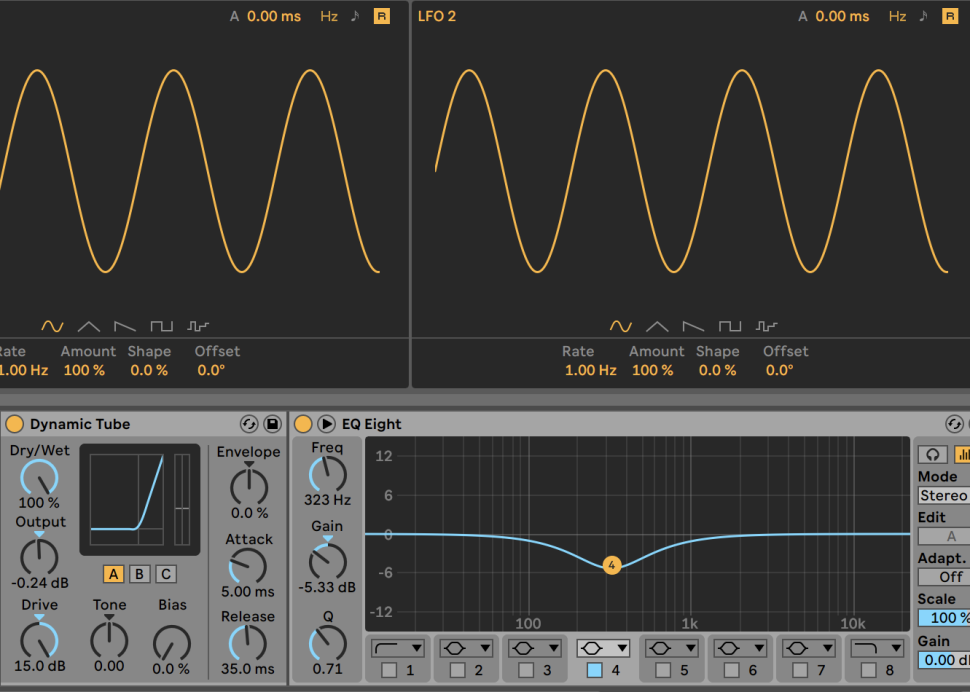 Hier spielt auch der Geschmack eine Rolle. Für uns haben die Decay-Werte von 600 ms und 45 ms bei einer Intensität von 36 und 48 auf Pitch funktioniert. Für mehr Wucht spendieren wir der Kick eine Dynamic Tube mit volle Pulle Drive, sowie einen EQ, der das Dröhnen um 323 Hz per Gain von -5 dB entfernt und Kick damit weniger grob ausfallen lässt.