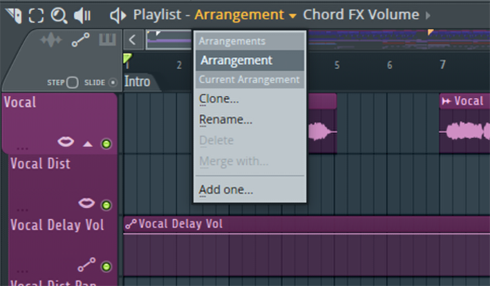 In der Toolbar finden Sie das Drop-Down-Menü Playlist – Arrangement, mit dem FL Studio neben dem aktuellen Arrangement weitere Arrangements zum Experimentieren anlegen kann. Diese stellt man sich am besten wie leere Blätter vor, die den Kopf freimachen und zu neuen Ideen anregen. Das Kopieren des aktuellen Arrangements als neue Vorlage ist aber ebenso möglich.