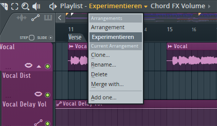 In unserem Beispiel-Projekt arbeiten wir an dem Chorus-Part unseres Songs und möchten aus diesem Material eine Variation erstellen. Das Antasten des aktuellen Songs kommt dabei nicht in Frage, aus diesem Grund klonen wir das Arrangement und arbeiten im Duplikat weiter. Damit keine Verwechslung aufkommt, nennen wir das Duplikat Experimentieren.