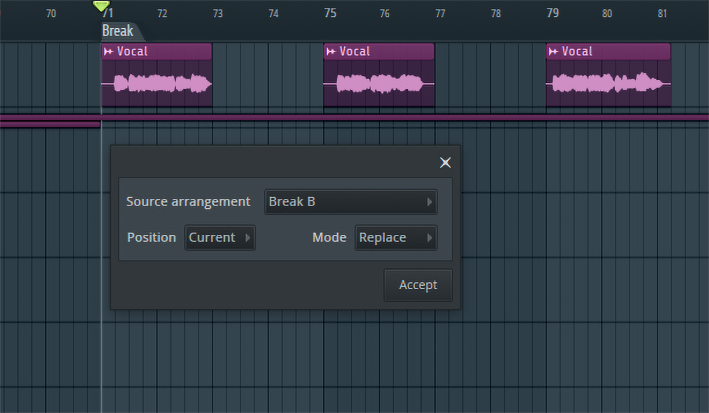 Bevor wir die neuen Kreationen ins eigentliche Song-Arrangement überführen, duplizieren wir dies und nennen es Sicherung. Im Song navigieren wir nun zum Break-Part und wählen anschließend im Arrangement-Menü den Punkt Merge with. Die Quelle ist Break B, die Position heißt Current und der Mode ist Replace. Jetzt wurde der alte Break-Part durch den Neuen ersetzt.
