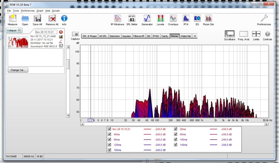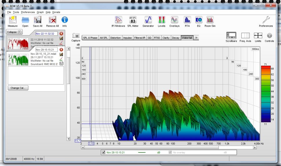 Nach dem Messvorgang präsentiert uns REW die Messergebnisse in Form eines dreidimensionalen Frequency-Response-Diagrams. Dessen X-Achse zeigt uns nicht nur den Frequenzverlauf der Raumimpulsantwort nebst Pegelverlauf auf der Y-Achse. Zusätzlich zeigt uns die Z-Achse noch die dazugehörige Zerfalls-, bzw. Nachhallzeit, die ein entscheidendes Beurteilungskriterium für unseren Raum darstellt.