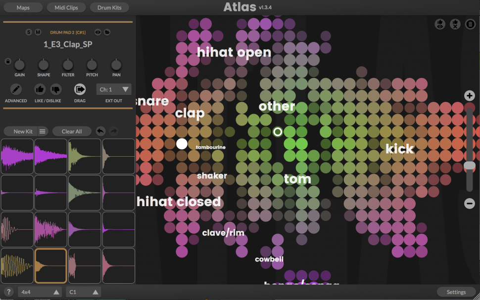 Atlas präsentiert sich in nüchterner Optik mit Drumpads und der so genannten Samplemap, die aus unzähligen Punkten besteht, die jeweils ein Sample repräsentieren. Je nach Art des Samples fällt seine Farbe aus, vordefinierte Begriffe die Clap, Snare oder Kick helfen bei der Übersicht. Neue Kits lassen sich schnell und ohne lästiges Wühlen im Browser erstellen, denn wird eine Snare gesucht, liegen diese sprichwörtlich alle auf einem Haufen.