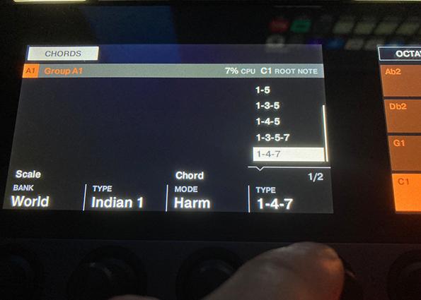 Die verfügbaren Typen entscheiden über die Zusammensetzung der Akkorde. Neben einer einfachen Oktavierung oder einem Grundton-Quinte-Modus (1-5), können Sie hier zusätzlich zwischen 1-3, 1-3-5, 1-4-5, 1-3-5-7, 1-4-7 wählen. In unserem Fall passte eine 1-3-5 Zusammensetzung am besten. Auf jedem Pad liegt nun ein Akkord, der zu der von Ihnen gewählten Skala passt.