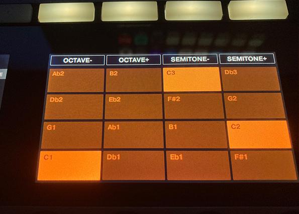 Begeben Sie sich nun zurück in den Pad-Mode und wählen Sie einen Klang, den Sie für die Akkorde nutzen möchten. Drücken Sie den Chords-Button oberhalb der Drum-Pads. Daraufhin werden auf dem linken Bildschirm zwei Kategorien angezeigt. Kategorie 1 zeigt die Skala an, die wir bereits definiert haben. Kategorie 2 widmet sich voll und ganz den Akkorden.