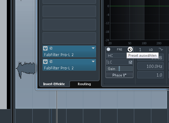 Als erstes laden wir zwei Instanzen des Fabfilter Pro L 2 in den Insertkanal unser Kanalspur. Die zwei Limiter werden in Reihe geschaltet und kommen in die letzten zwei Slots unserer Masteringkette, sodass sie den Abschluss des Signalflusses bilden. Alle anderen Effekte wie Equalizer, Kompressor und Verzerrer werden vor die Limiter geschaltet.
