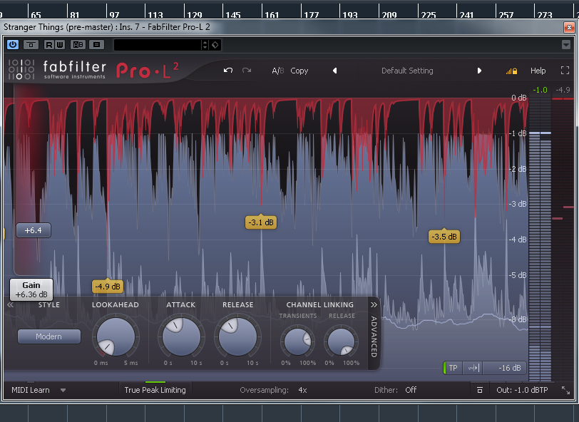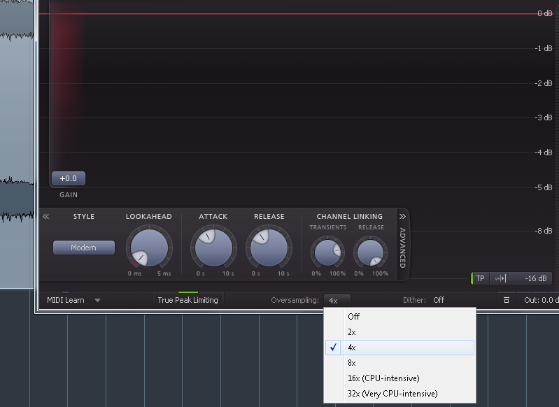Als erstes stellen wir die Limiter richtig für den Mastering Prozess ein: Um die Klangqualität zu erhöhen, setzen wir das Oversampling auf 4x. Dieser Wert ist ein guter Kompromiss zwischen CPU Auslastung und Qualitätserhöhung. So wird mögliches Aliasing stark reduziert. Dies kann auftreten wenn der Limiter besonders stark und schnell arbeiten muss.