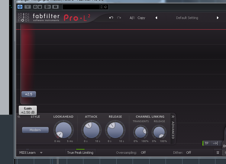 Nun stellen wir den Gain-Regler bei dem zweiten Limiter auf +2dB. Nun können wir mit dem ersten Limiter in den zweiten Limiter hinein fahren und der zweite Limiter muss nie mehr als mit 2dB Gainreduction arbeiten. Die verhindert das Verzerrungen durch den zweiten Limiter entstehen, welche bei einer zu hohen Gainreduction auftreten können.