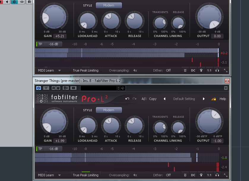 Zum Schluss kontrollieren wir noch einmal die Gainreduction der beiden Limiter. Die beiden Gain-Regler sollten so eingestellt sein, dass die jeweilige Gainreduction nicht höher als maximal 3dB beträgt. Durch diesen Limiter-Stacking-Trick können wir die Arbeit eines Limiters auf zwei verteilen, was sich in einem viel weicheren Klangbild zeigt.