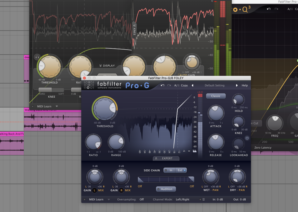 Öffnen Sie einen Song mit einer Bassline oder Melodie, die zwar gut ist, aber der noch das gewisse Etwas fehlt. Erzeugen Sie eine Audio-spur und laden eine Field Recording Aufnahme darauf. Wir verwenden Walking Back And Forth.wav von den Heft-Daten. Dessen Spur statten wir mit einem Kompressor, EQ und Noise-Gate aus, etwa Pro-G von FabFilter.