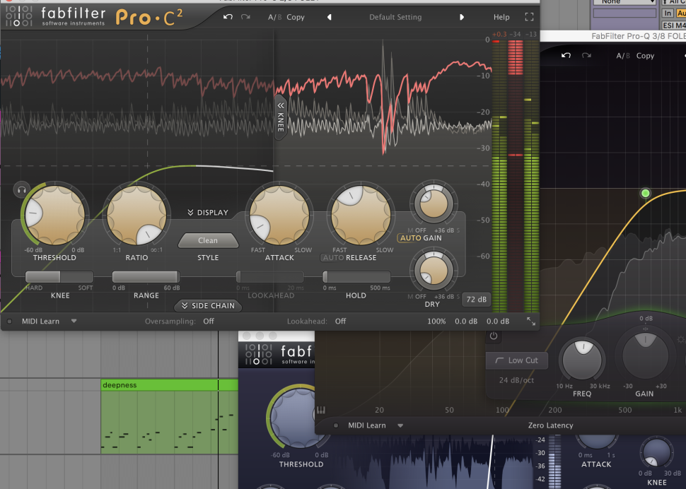 Drehen Sie den Regler dann langsam herunter, bis die Texturen im gewünschten Maß zu hören sind. Stellen Sie als Ausgangsbasis Attack auf 44 ms und Release auf 300 ms, damit der Effekt nicht abgehackt klingt und variieren die beiden Parameter anschließend so, dass der Effekt Ihrem Geschmack entspricht und zur Sequenz bzw. der Melodie passt.