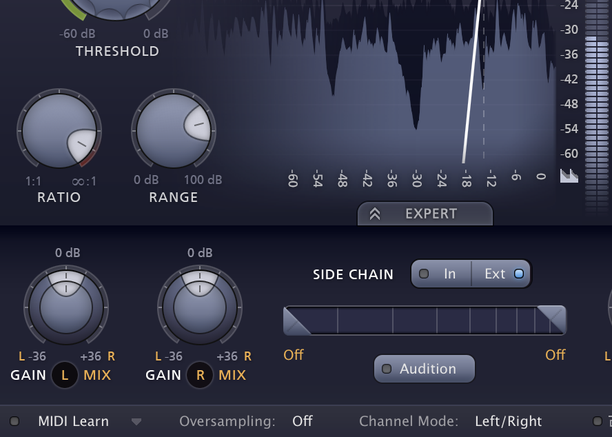 Zurück zum Gate: Starten Sie die Wiedergabe und fahren den THRESHOLD-Regler komplett hoch, damit das Field Recording erstmal permanent zu hören ist und schalten SIDE CHAIN auf Ext, womit das Sidechaining überhaupt erst auf dem externen Eingang reagiert. Per Audition können Sie kontrollieren, ob die Bassline auch korrekt ins Plug-in geroutet wird.