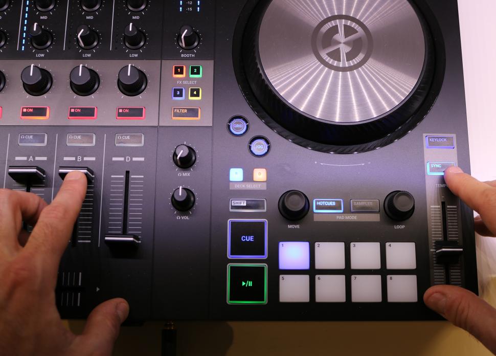 Dann schieben wir Fader A hoch und drücken an Deck A Play. In B gleichen wir per Sync-Taste das Tempo an, drehen in Kanal B den Bass heraus und schieben den Fader hoch. An geeigneter Stelle in A starten wir die Wiedergabe von B. Dies kann zum Beispiel am Ende des letzten Drops sein, dessen Position sich im Waveform-Display gut abschätzen lässt.