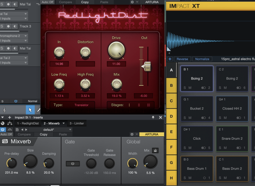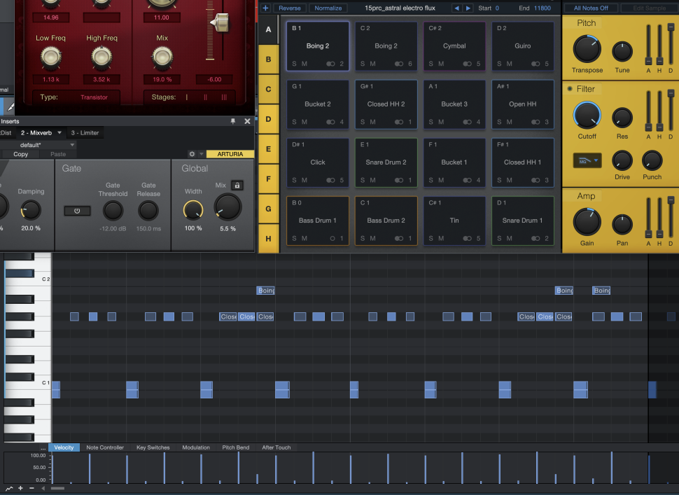 Die Velocity dieser Kopien setzen wir für ein Shaker-Feeling auf Minimum. Den „Boing“-Sound von Pad 13 streuen wir auch ein, transponiert um 18 Halbtöne nach oben. Damit entspricht er der Tonlage C. Im Impact stellen wir sicher, dass alle Pads zu Stereo Out 1 geroutet werden und laden für diesen im Mixer die Effekte RedlightDist, Mixverb und Limiter.