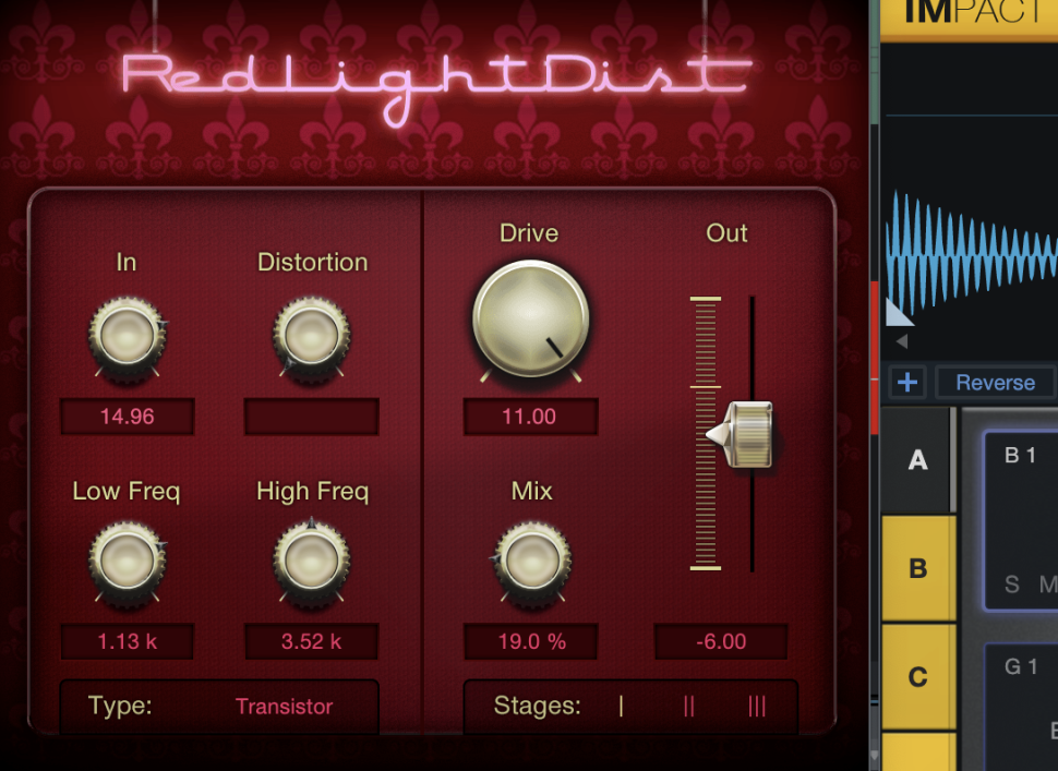 Den Type von RedLight stellen wir auf Transistor und grenzen den zu verzerrenden Bereich mit Low Freq 1.1k und High Freq 3.5k auf die Mitten ein, drehen Drive aber voll auf und mischen alles per Mix auf 9 Uhr dezent bei. Die Hi-Hats klingen damit wesentlich crisper und die Kick knackiger. Per MixVerb mit 5% Mix sorgen wir für einen Hauch Raum.