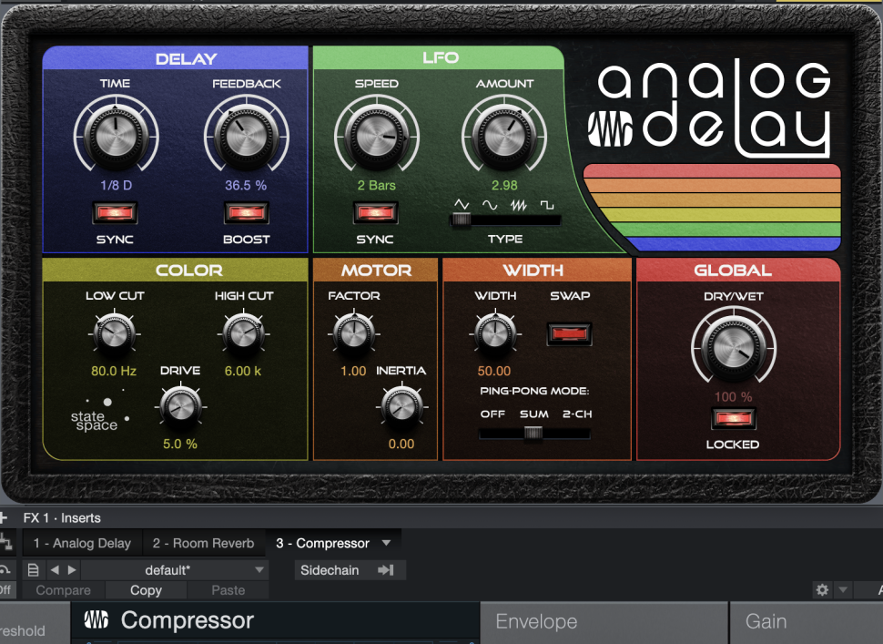 Den eigentlich hypnotischen Effekt erzeugen wir mit dem Analog Delay auf einem FX-Channel. Das „Analog Pong“ Preset ist ein perfekter Ausgangspunkt, wir drehen lediglich Delay Feedback und LFO Amount ein klein wenig weiter auf. Hinter das Delay laden wir einen Compressor mit Threshold -38 dB und Release 13 ms, der per Sidechain getriggert wird.
