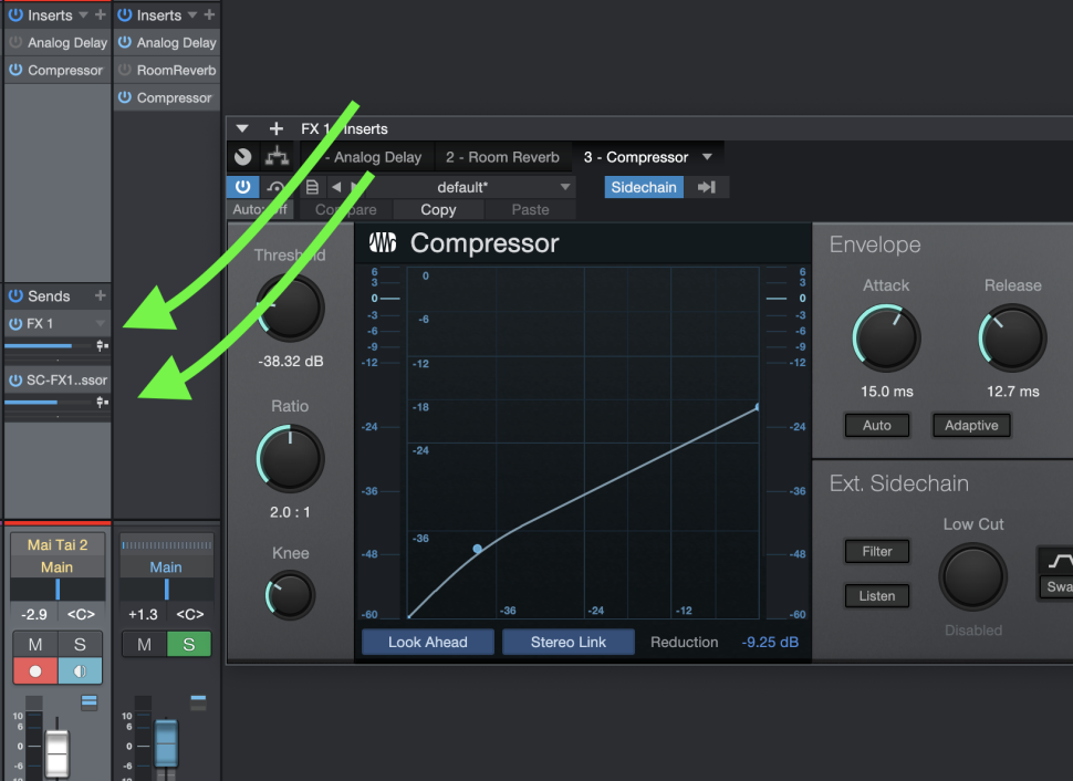 Den Mai Tai Channel führen wir über die Sends einerseits in den FX-Channel zum Delay und andererseits über einen zweiten Send-Weg in den Sidechain-Eingang des Kompressors. Dieser sorgt dafür, dass das Delay geduckt wird, wenn der Mai Tai eine Note wiedergibt, was für mehr Klarheit im Mix sorgt. Ebenso ducken wir den Synth über die Kick von Pad 1.