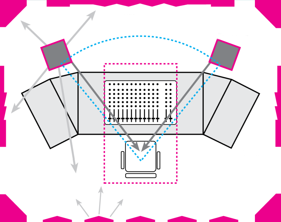Reine Diffusion macht in vielen Räumen einfach keinen Sinn, vor allem wenn die Räume nicht groß genug sind. Zum einen haben manche Diffusorentypen wie QRD Diffusoren gewisse Mindestabstände, die man einhalten sollte, zum anderen sind die meisten Reflexionen in kleinen Räumen Erstreflektionen. Diese mit Diffusion zu behandeln ist in einem Studiokontext nicht förderlich. Erstreflektionen sollten idealerweise absorbiert werden, benutzt man Diffusoren nimmt man zwar Einfluss auf diese Erstreflektionen, entfernt sie aber nicht. Somit wird das Originalsignal, also der Klang unserer Lautsprecher, beeinflusst. Oft liest man, Diffusion lasse Räume “größer” erscheinen. Dies bezieht sich vor allem darauf, dass im hinteren Bereich des Raums, durch Diffusion Reflexionen verzögert werden. Heißt, die Reflexionen kommen später bei uns an, als es für einen Raum dieser Größe zu erwarten wäre. Unser Gehirn hat hierfür ein minder oder mehr gutes Gespür. Somit ist der Effekt erst mal vorhanden, allerdings funktioniert das Ganze nicht in kleinen Räumen, da hier nicht genug Platz vorhanden ist, damit die Diffusion richtig funktionieren könnte. Kleine Räume mit Diffusion größer wirken lassen, ist also ein Mythos.