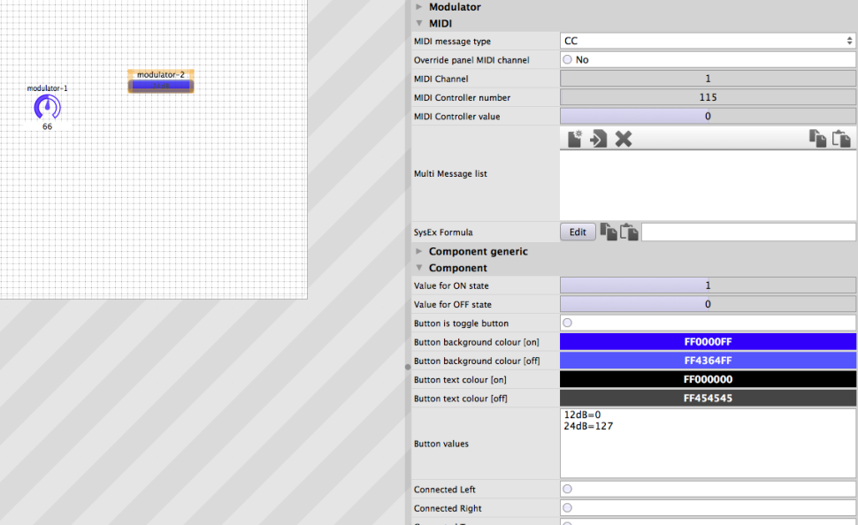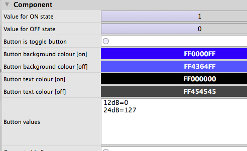 Für Knöpfe und Auswahlmenüs machen Schieberegler jedoch keinen Sinn, hier benötigen wir andere Werkzeuge. So lieferte der Schalter für die Filter-Flankensteilheit neben seiner CC-Nummer 15 die beiden Werte 0 und 127 (0 für 24dB und 127 für 12dB). Fügen Sie zum Steuern einen uiButton hinzu, stellen dessen Message type auf CC und tragen als Controller number 115 ein. Scrollen Sie zu Button values.