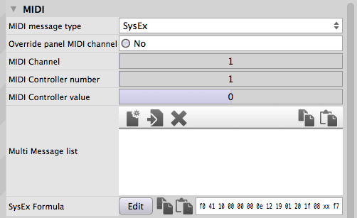 Den Wert finden Sie durch Drehen am Regler, denn dann ändert sich in den durchlaufenden Daten nur dieser eine Block. Kopieren Sie die Zeichenkette zwischen den eckigen Klammern und erstellen einen uiSlider im Panel. Der Message type ist diesmal SysEx. Fügen Sie die kopierten Zeichen bei SysEx Formula ein und ersetzen den Block mit dem Wert mit „xx“. Dieser Block wird dann vom Slider gesteuert.