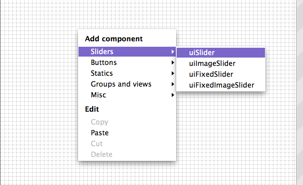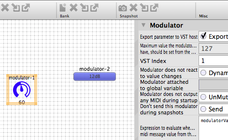 Schalten Sie das Panel in den Bearbeiten-Modus (ein kariertes Muster wird sichtbar) und rechtsklicken in den weißen Bereich. Als erste Komponente fügen wir einen uiSlider hinzu. Klicken Sie den Regler an, werden dessen Eigenschaften im rechten Fenster eingeblendet. Den Abschnitt Modulator können Sie einklappen. Doppelklicken Sie unter MIDI auf MIDI Controller number und tragen die 3 ein.