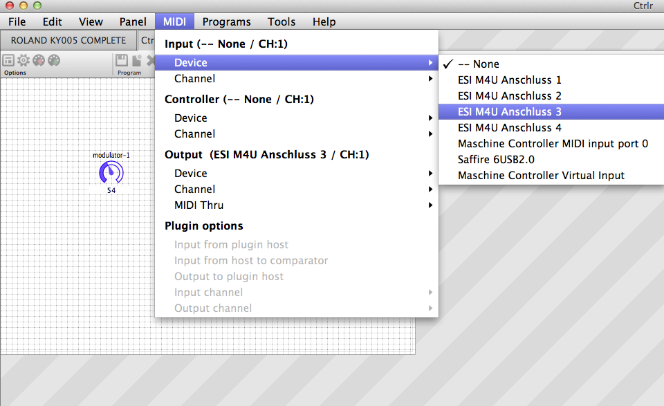 Um Ihren Hardware Synth einzubinden, verbinden Sie die entsprechenden Ports im MIDI Menü bei Input- und Output-Device. Controller Device benötigen wir nicht und die Plugin Optionen folgen später. Zur Kontrolle der ein- und ausgehenden Midi-Daten aktivieren wir den Midi Monitor aus dem Tools Menü. Um nun einen Regler des Synths per CTRLR zu steuern, müssen wir dessen Controller-Nummer kennen.