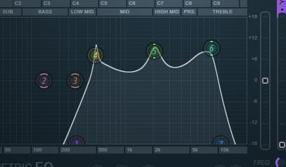 Mit dem EQ arbeiten wir die Frequenzen heraus, welche die Vocals am meisten betonen. Ein guter Start sind die Bereiche um 500 Hz, 5 kHz und 12 kHz, das variiert jedoch mit der Sängerin bzw. dem Sänger. In jedem Falle stellen wir die Bandbreite von Band 1 und 7 auf Maximum, fahren Band 1 auf 300 Hz und dessen Gain auf null. Band 7 wiederum lassen wir die Höhen ab 10 kHz wegschneiden.