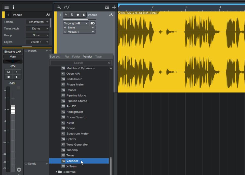 Um den Vocoder von Studio One auszuprobieren, laden wir zunächst eine Gesangsaufnahme auf eine Audiospur. Aktiviere dann Vocoder als Insert-Effekt. Standardmäßig liefert der integrierte Synthesizer des Vocoders das Träger-Signal (Carrier). Er stellt drei Wellenformen bereit: Sägezahn, Rechteck und Rauschen, was sich für stimmlose Gesangseffekte eignet.