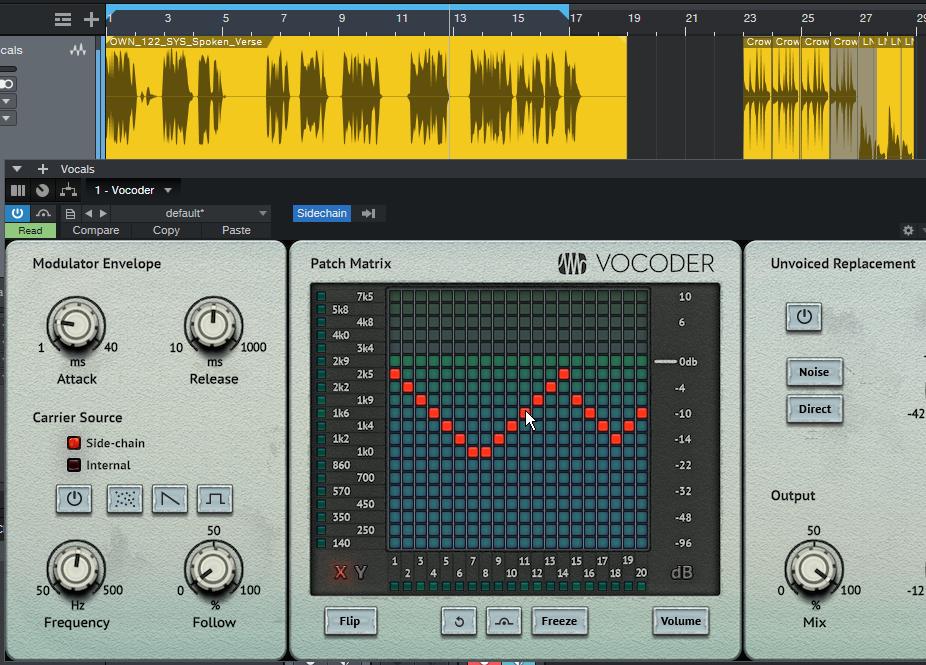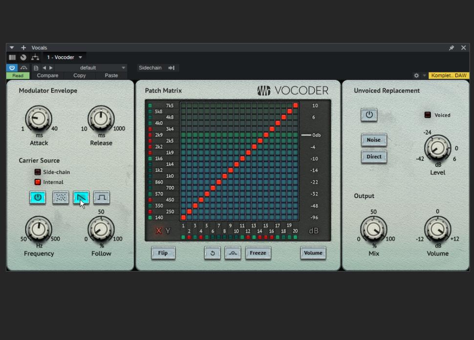 Aktiviere außerdem die Glide-Option und stelle Glide Time auf etwa 40 ms. Für noch mehr Funk kannst du natürlich auch das Pitch-Rad deines Keyboards nutzen. Durch Einzeichnen von Kurven in der Patch Matrix kannst du den Vocoder-Sound drastisch verändern, z. B. um die Sprachverständlichkeit zu erhöhen oder Vocals stärker zu entfremden.