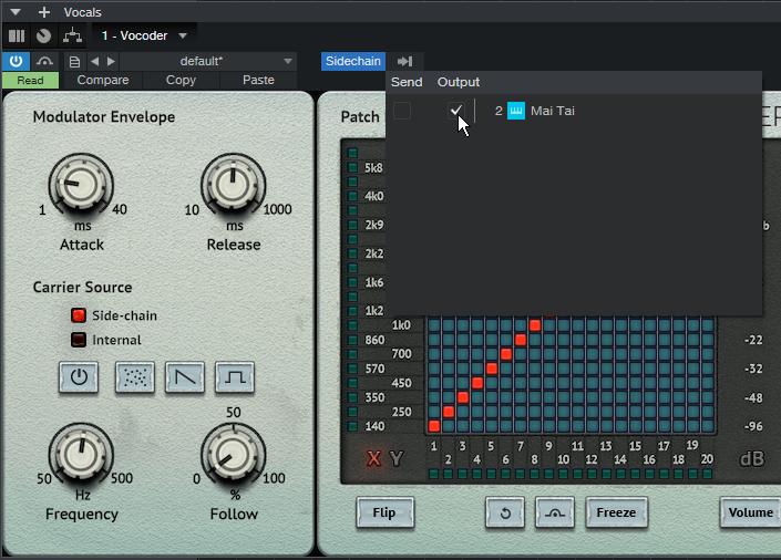 Das Preset Synthex Poly eignet sich gut für unseren Zweck. Wir deaktivieren nur die Effekte Phaser und Delay des Synthesizers. Aktiviere dann oben auf der Bedienoberfläche des Vocoders das Sidechaining und klicke anschließend auf Source-Symbol rechts daneben. Setze hier wie abgebildet einen Haken in dem Output-Kästchen neben Mai Tai.