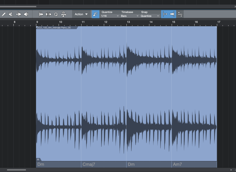 Für den Anfang suchen wir nach einer melodischen Vorlage für unseren neuen Song. Diese Vorlage kann theoretisch alles sein: ein ganzer Song, ein Sample oder vielleicht sogar eine Vocal-Aufnahme. Wichtig ist, dass Ihnen die melodische Stimmung zusagt. In unserem Falle hat es beim Loop DC2_100_Am_Intimate Piano_05.wav gefunkt (siehe Heft-Daten).