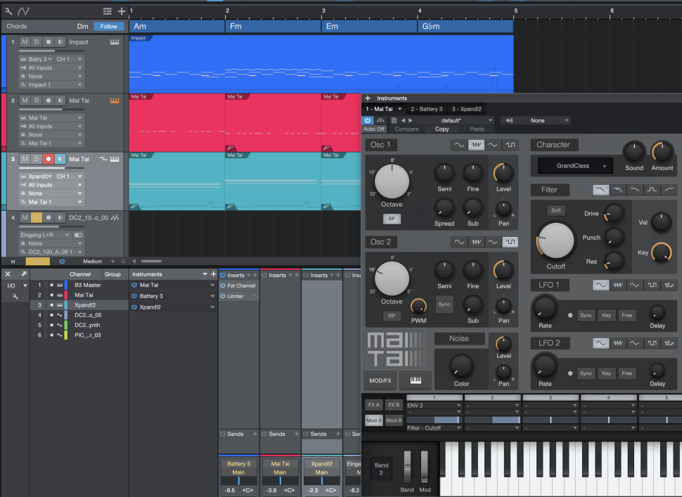 Jetzt stellen wir das Gitarren-Sample noch auf Reverse-Wiedergabe und ziehen das Room-Reverb drauf. Fertig ist ein komplett neues und harmonisches Playback, bei dem vom Ur-Sample nichts mehr zu hören ist. Ähnlich läuft es aber auch ohne Samples: Hierfür spielen wir eine Bassline auf konstanter Tonlage ein und mit einem zweiten Synth nur einen Akkord.